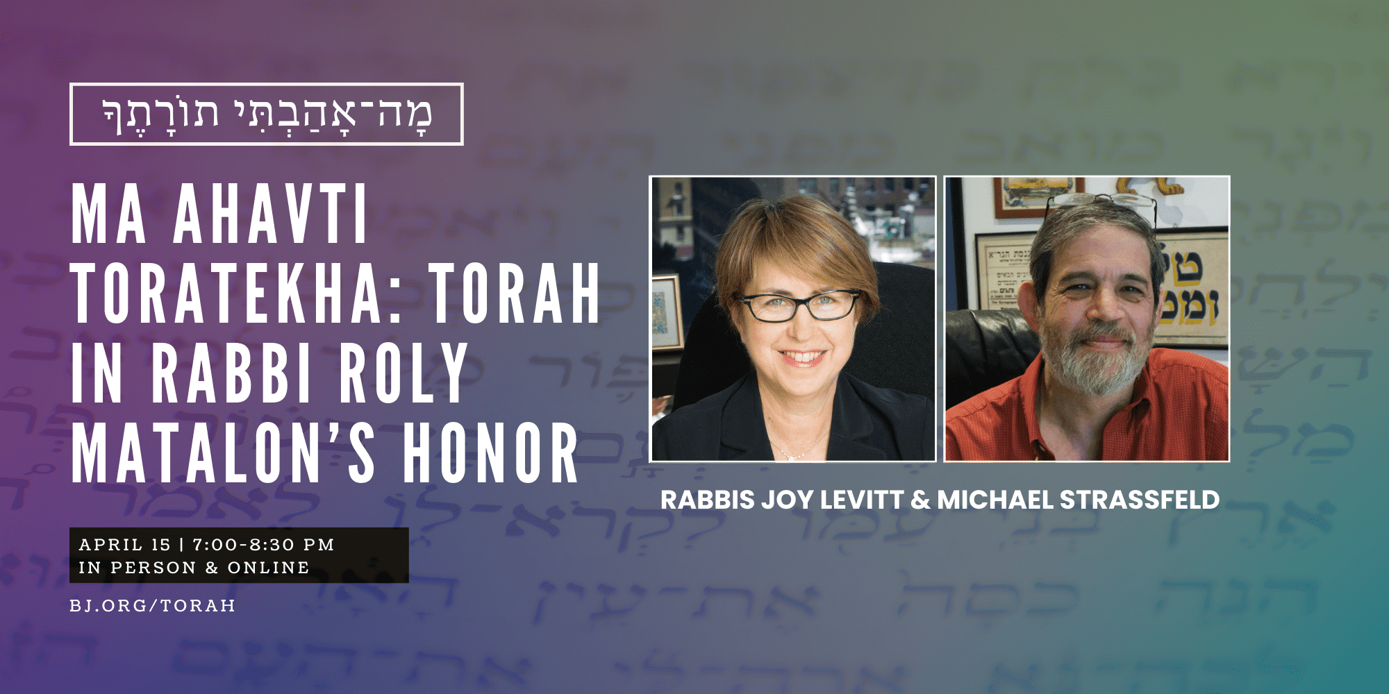• Ma Ahavti Toratekha: Torah in Rabbi Roly Matalon’s Honor with Rabbis Joy Levitt and Michael Strassfeld